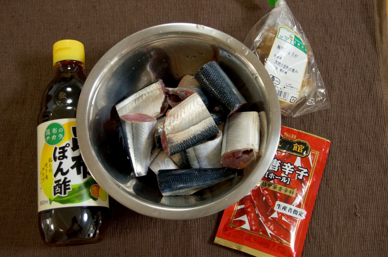 さて、よーやく下準備が終了です。今回のまかないメニュー「サンマのポン酢deさっぱり煮」の材料はこんなかんじ。
