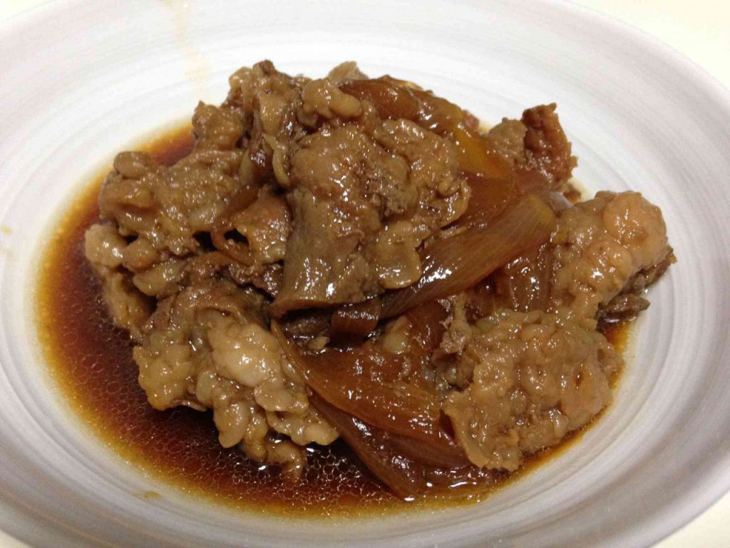 ちょっと茹で汁を味見してみたところ、臭みもなかったですし、茹でる前に一切れ焼いて食べてみたときも全然行けそうな気配だったので、臭み取りのことは忘れることにしました…。結果。茹で汁を少し残して、醤油と砂糖と酒を同量ずつ肉が浸るくらい入れて、、ざく切りした玉ねぎをON。