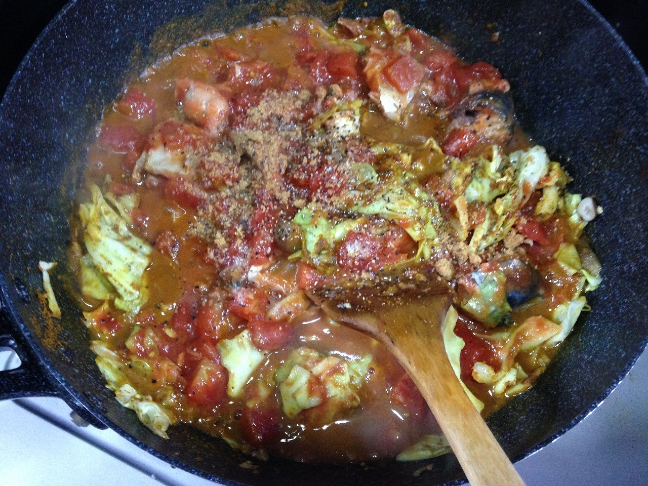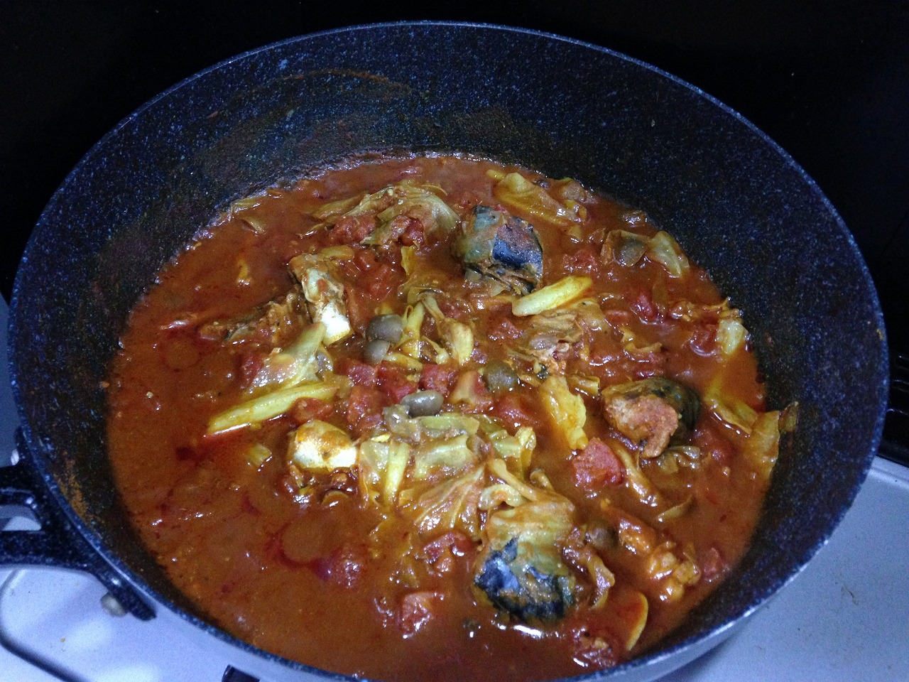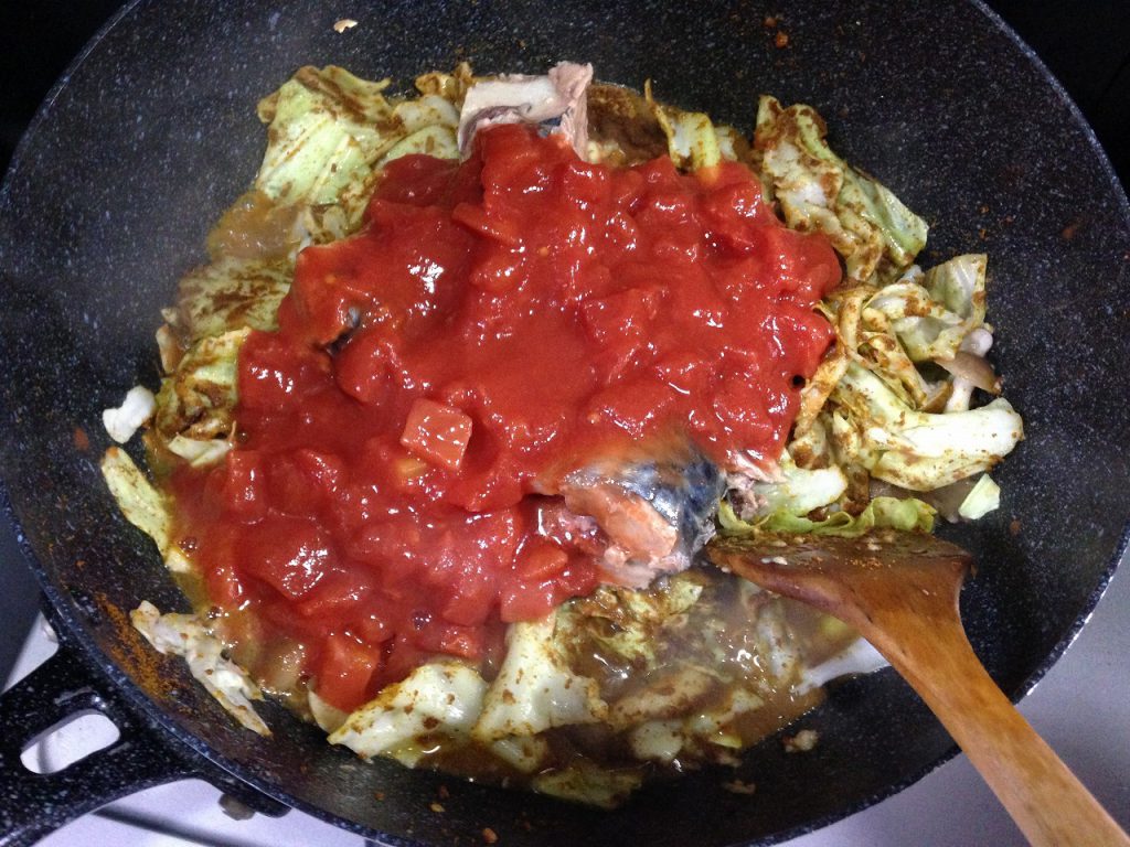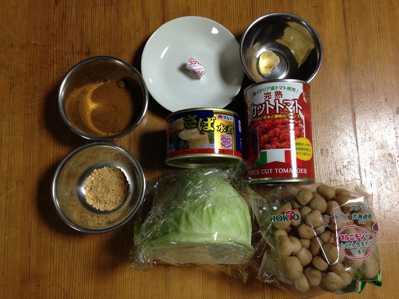 鯖の水煮缶はだいたい常備しているし、ホールトマト缶も結構常備している。なんなら鯖の水煮缶のほうがホールトマト缶よりも高いですよね。カレー粉もちと古いので使い切ってしまいたかったし、近所のセブンイレブンでたまに売ってる激安地元野菜のキャベツも消費するべきでしたし。