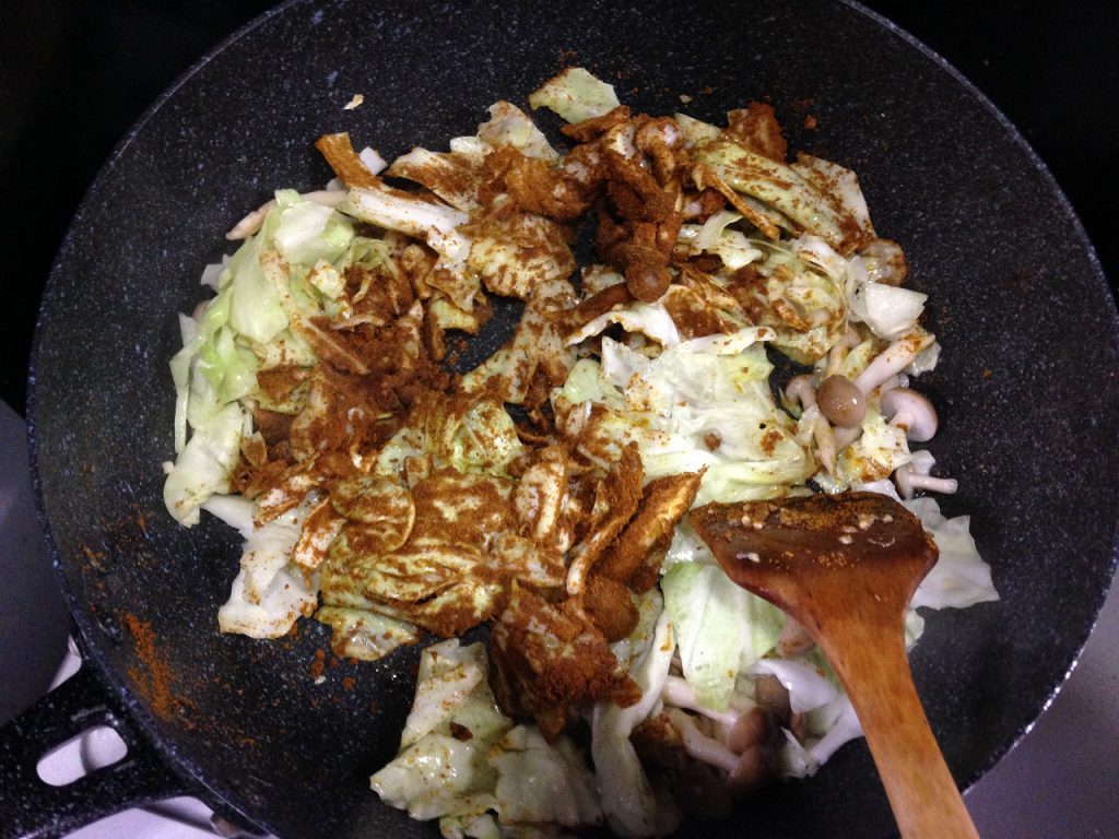 葉ときのこがしんなりとしたので、カレー粉を入れた様子