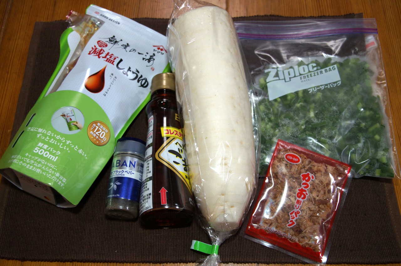 しょうゆは減塩のものをいつも使用していますが、今のところこの「鮮度の一滴(ヤマサ)減塩しょうゆ」が一番嫌な感じがせず美味しい気がしています。あ、大根は新たに購入。