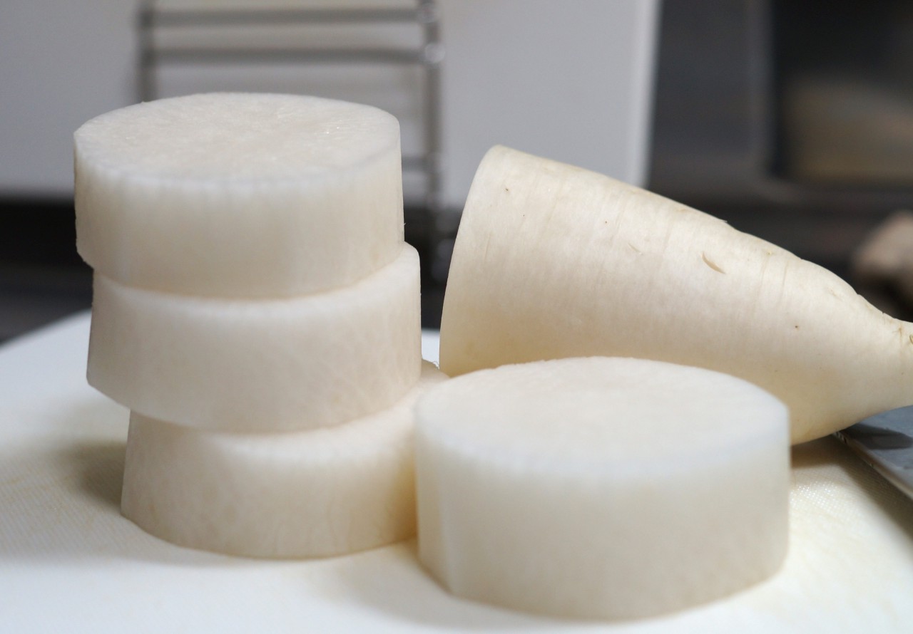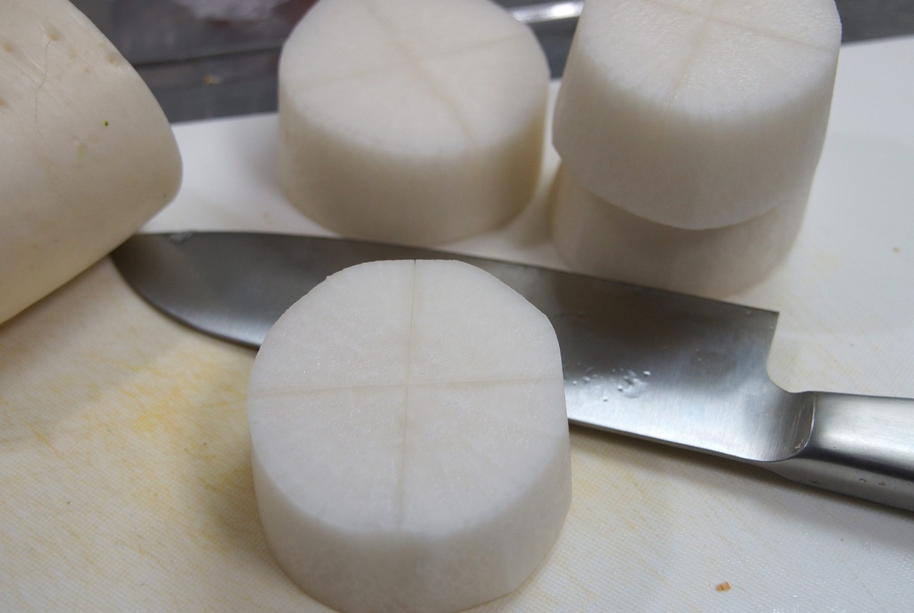 2. 輪切りに大根に、十文字の切れ込みを入れてもしょうが無いじゃん。大根は縦に繊維が走ってるんだから。繊維を切らないと柔らかくならないじゃん。繊維に沿って薄く切って、油で炒めて、お湯に入れて油抜きか、カブを使え。というか、カブを煮て味噌か醤油で味付けが、早くて1番。ただし皮は厚くむけ。椀物が良いけど。
