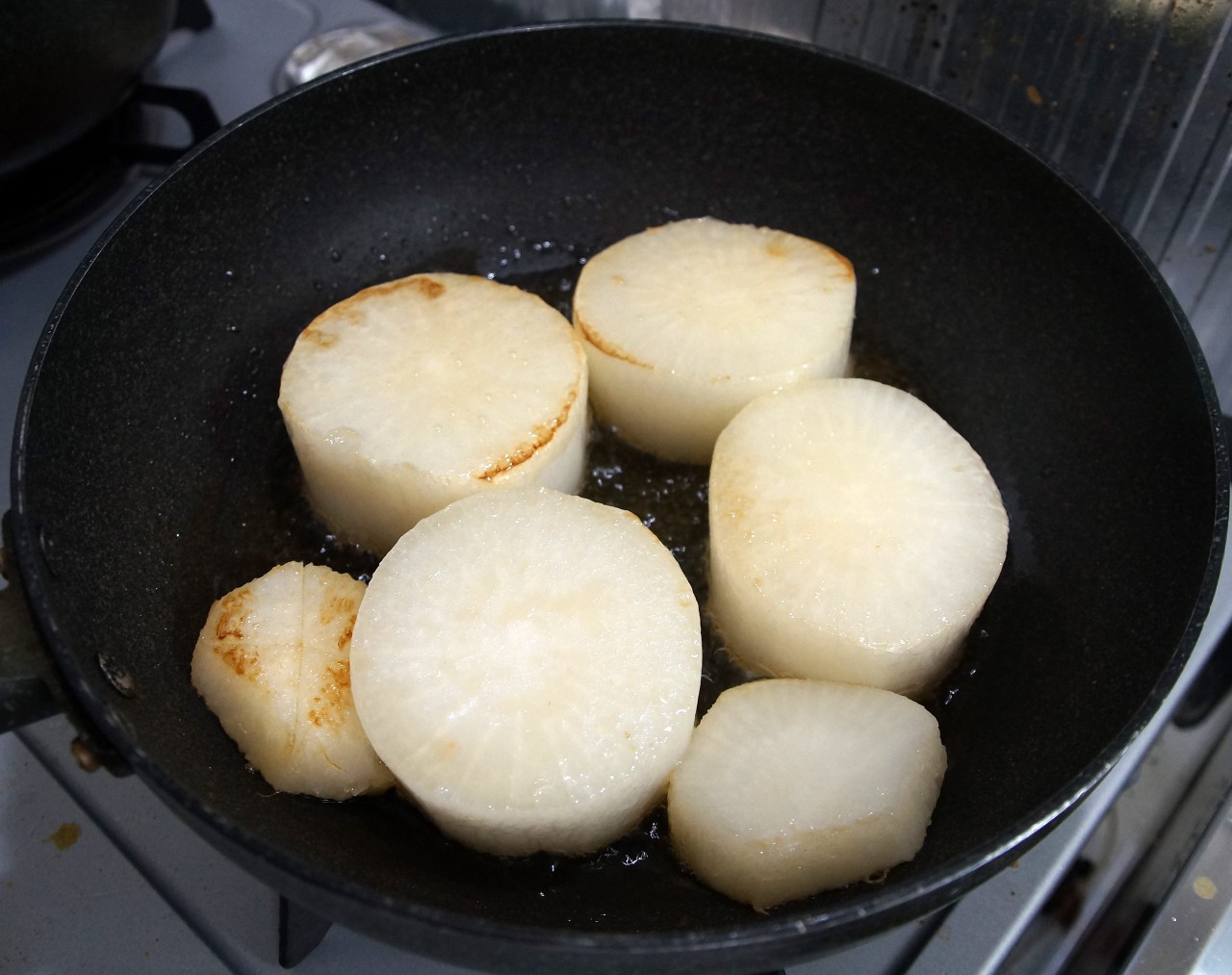 2.ごま油大さじ3(結構な量ですぜ)をあたためておいて大根を投入。片面につき4分から5分蓋をして弱火で焼き色を付けます。真ん中のちょっと焼いた感がある大根がレシピ通りに焼いたものなんだけども、こんなんでいいのか不安。小さくて薄い大根は大根おろしを作った時に余ったのでついでに入れました。