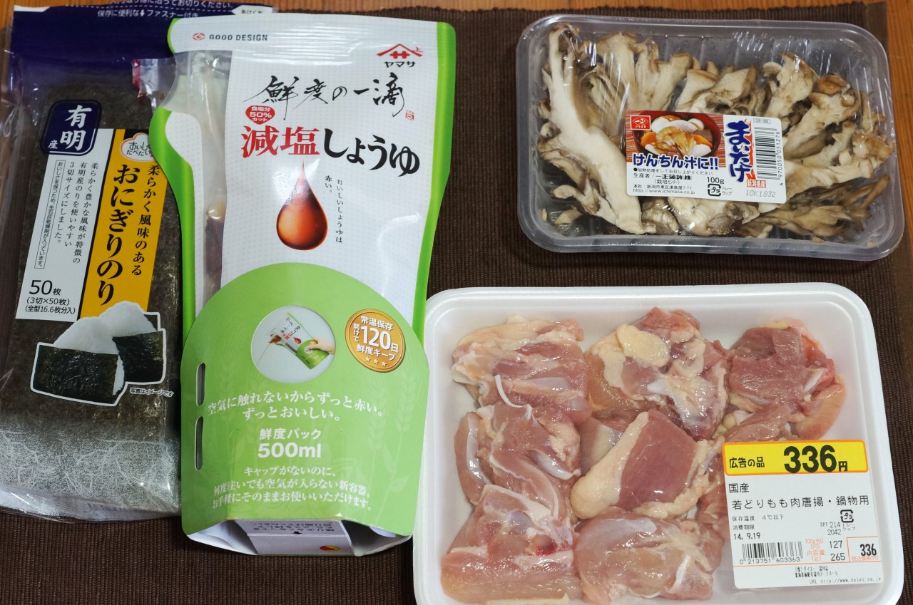 て。て。分量が全くわからないぜ。一口大に鶏もも肉を切ったら見た目の量がコンモリしたので、4食分くらいあるかいね・・・ってことで、750mlくらいの水で茹でて、アクを取って、焼き海苔をチギって投入。舞茸もザザザっと投入。