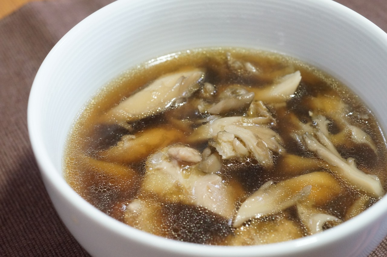 きのう私のツイッター乗っ取られたみたい。のっとり記念に、のり・とりスープ教えます!鶏ももを一口大に切って水から煮て、アク取っていいダシ出たら、焼き海苔を溶かして醤油で仕上げ。舞茸も一緒に入れれば、のっとりまいったっけスープの完成です!