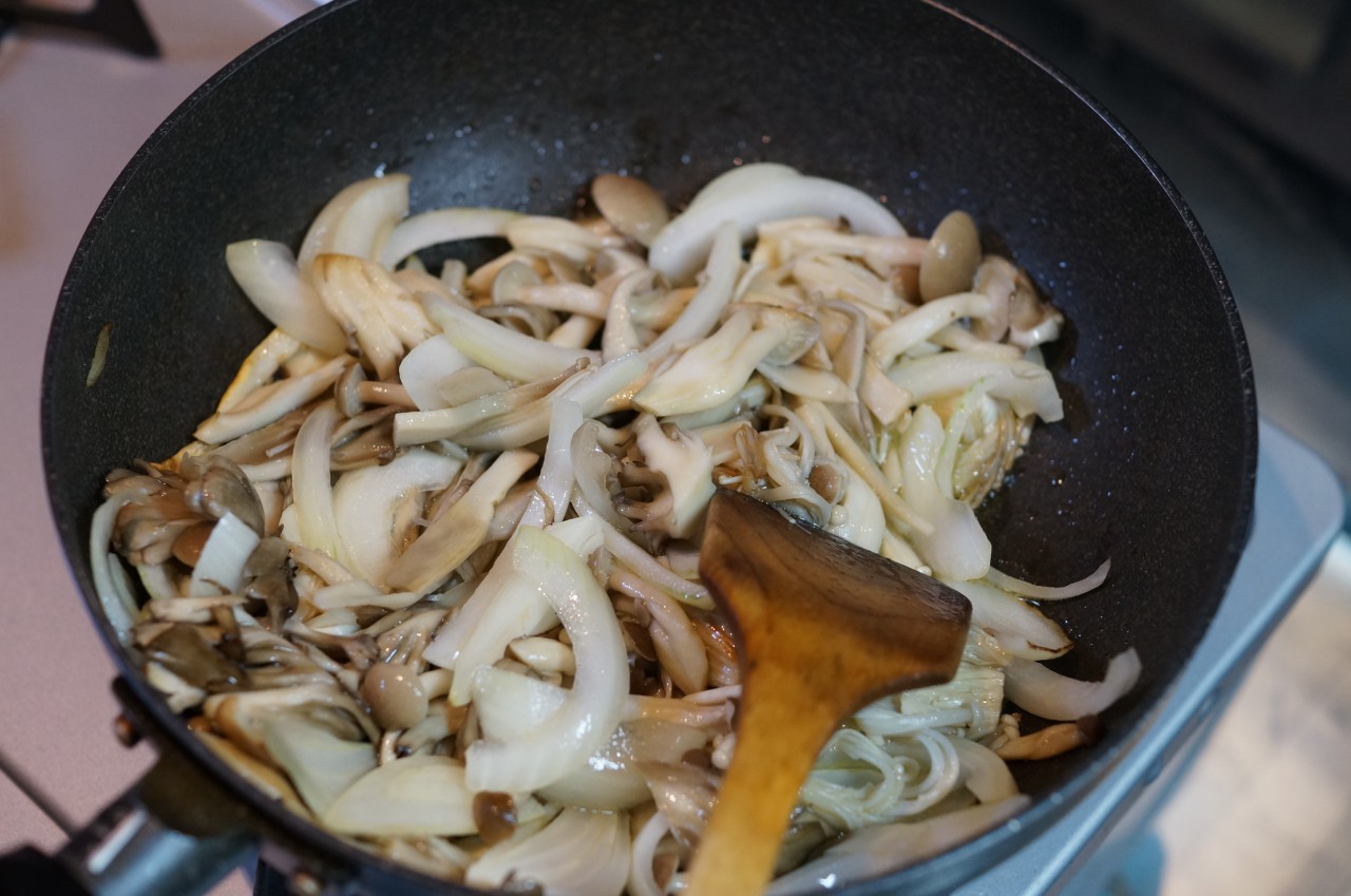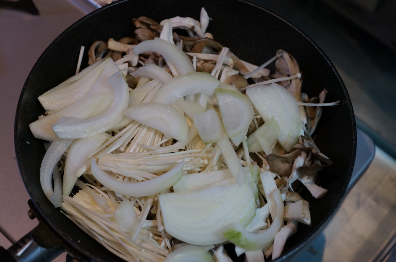 とりあえず、きのこをバラします。エリンギは拍子切りとのことだったので、包丁でサササっと。手で引き裂いてもいいと思いまする。っちゅーか、1/2量だってのに当事務所のキッチンにあるザル(大)に盛り盛り。きのこは火を入れるとカサが減るものですが、こんなにたくさんあって大丈夫なのかな。。。てか、北海道で売ってるきのこの1パックの量は多いの…?って思っちゃうくらい。