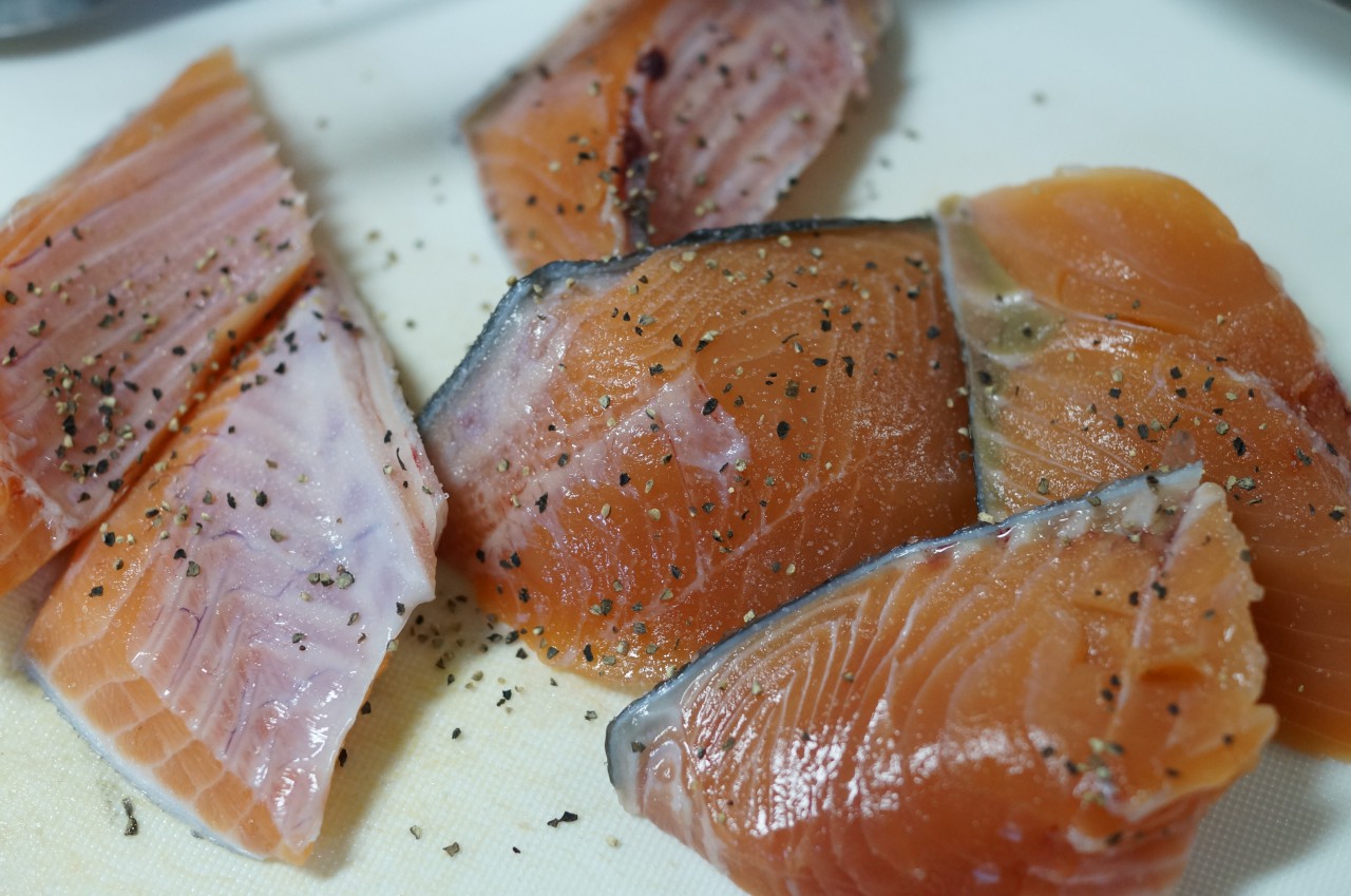 鮭の切り身2切れを、それぞれ包丁で3つずつにぶつ切りにして、塩コショウ。斜めに包丁を入れるといいらしいですよ。