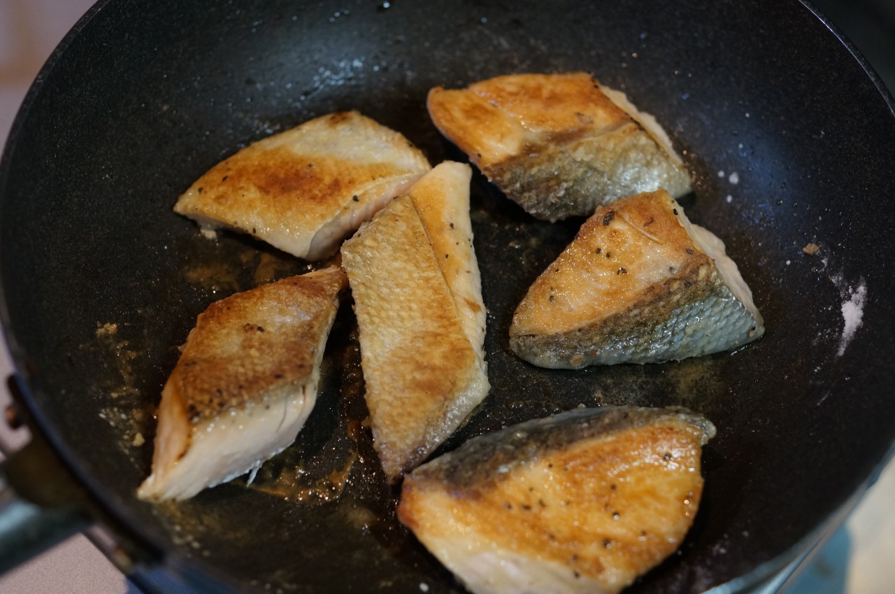 小麦粉をボウルに入れておいて、鮭の切り身の表裏に貼り付けつつ、オリーブオイル大さじ3を熱しておいたフライパンに並べて焼きます。皮の方から焼くといいみたいですね。ときどきフライパンを揺すって焦げつき防止をするべし!と元レシピに書いてあります。
