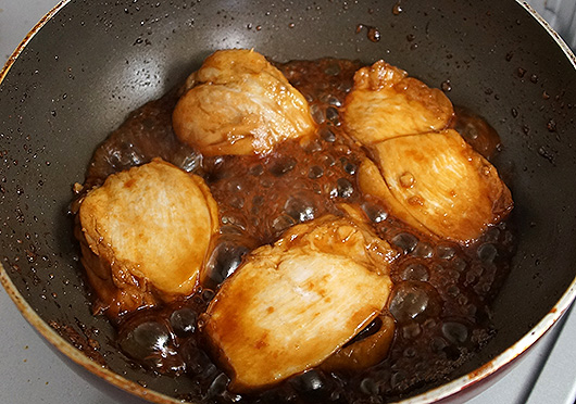 ということですが、うちで使っている砂糖が上白糖ではなくきび砂糖のようなものだからか、タレがグツグツとカラメル状になるのが予想よりも早い。以前にも同じ失敗をしたことがあるのですが、ほうっておくとただの苦い物体になってしまうばかりか、火の通りも甘くなってしまうので、急遽追い酒、追いしょう油を敢行。砂糖はいれません。比率は元レシピに則って3:2くらい。