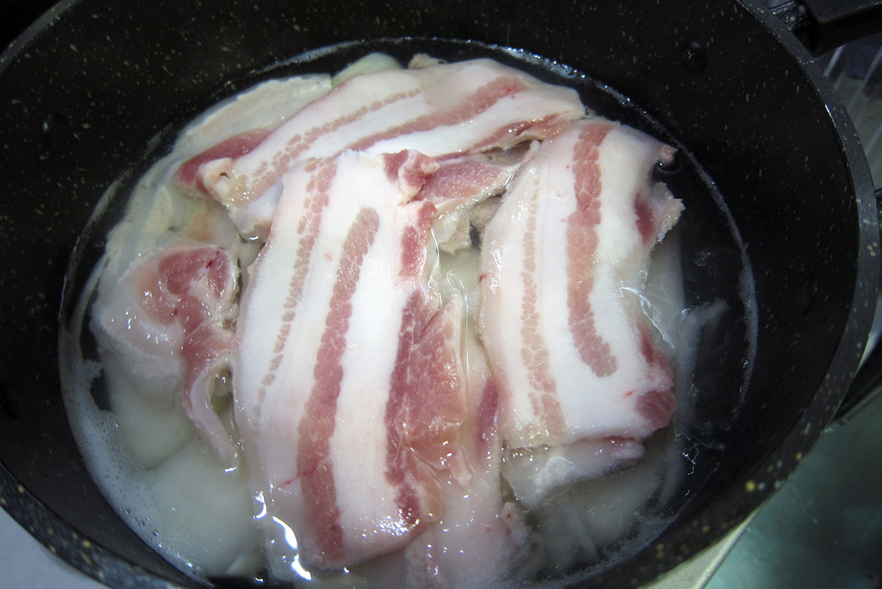 豚バラの色が変わるまで茹でます。ついでに灰汁も取ります。肉が煮えたら、肉だけを一旦ザルにでも上げておきます。