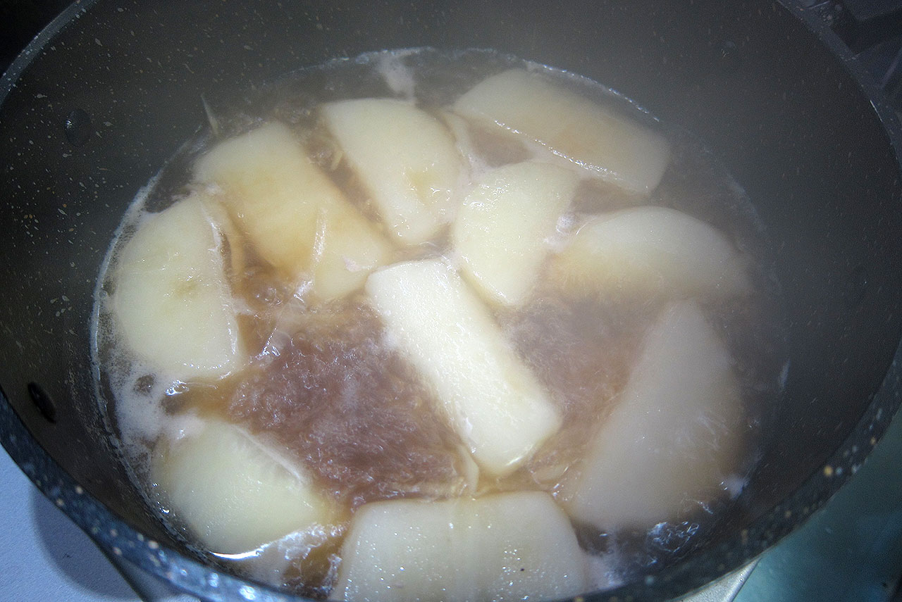 日本酒を入れて、中火。沸騰したら弱火で、昆布もエグみが出るので取って、灰汁を取りながらぐつぐつ煮込みます。15分位ですかねーグツグツ状態を続けた大根に菜箸を刺すとスッと刺せる柔らかさになっていたら、おk。