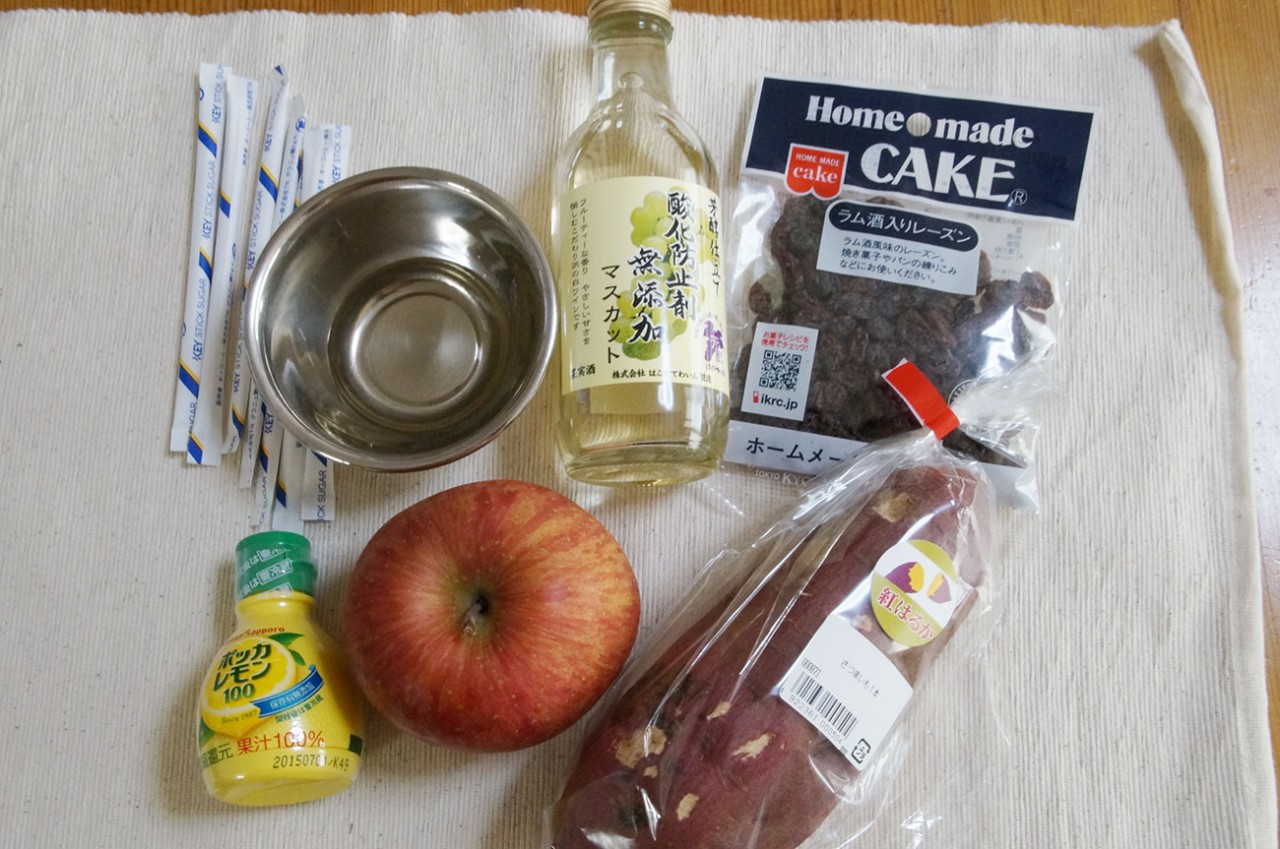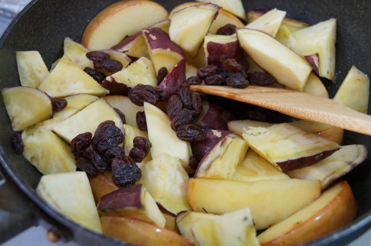 リンゴが半透明になったら、干しぶどうとサツマイモを投入。ざっと火が通った感じになったらば、グラニュー糖、白ワイン、レモン汁をザーッと入れます。