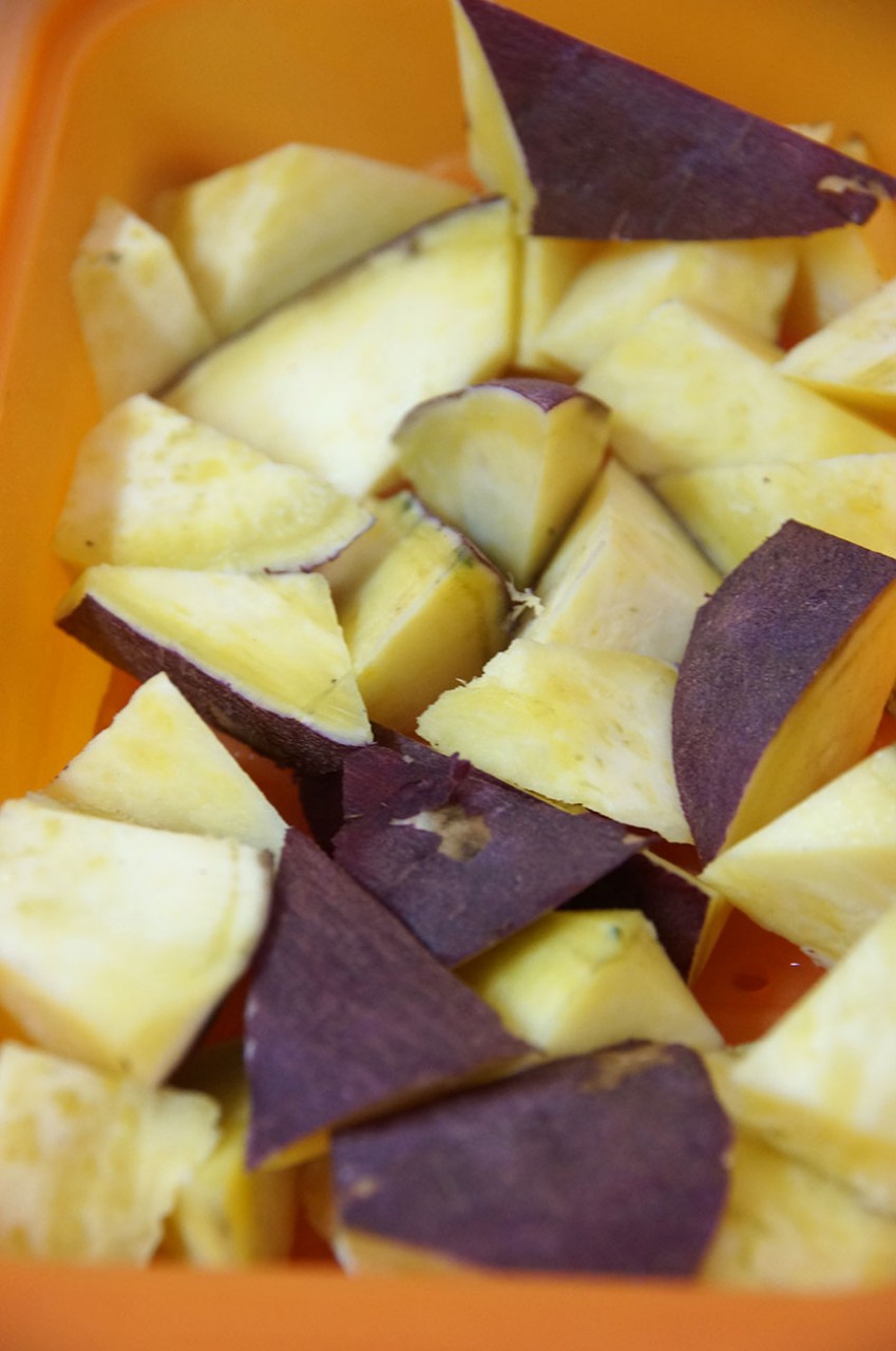 レアでしたので、乱切りにした後シリコンスチーマーに詰めて、水を振って再度レンチン2分。この後火も通すので、まあ、おおまかに熱が入っていればいいかな・・・・・・。