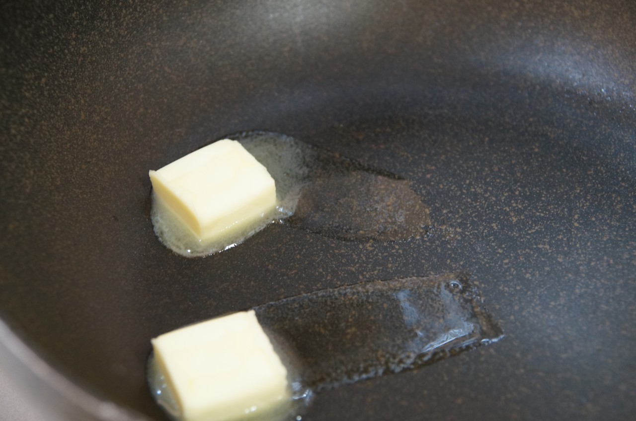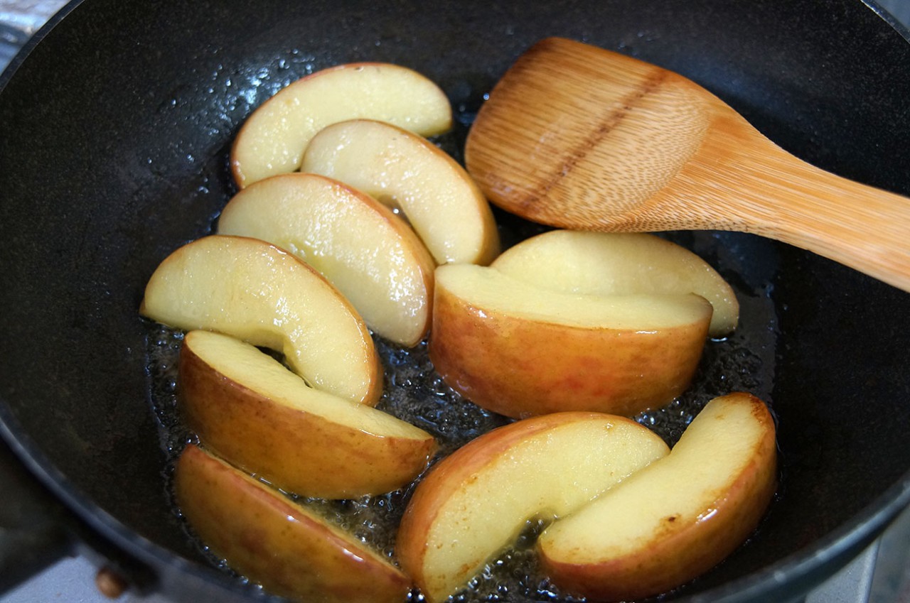 フライパンにバターを溶かして、リンゴを投入。弱中火でフタをして柔らかそうになるまで炒めます。この時点ですでに、あま~い香りが部屋中に充満(・∀・)