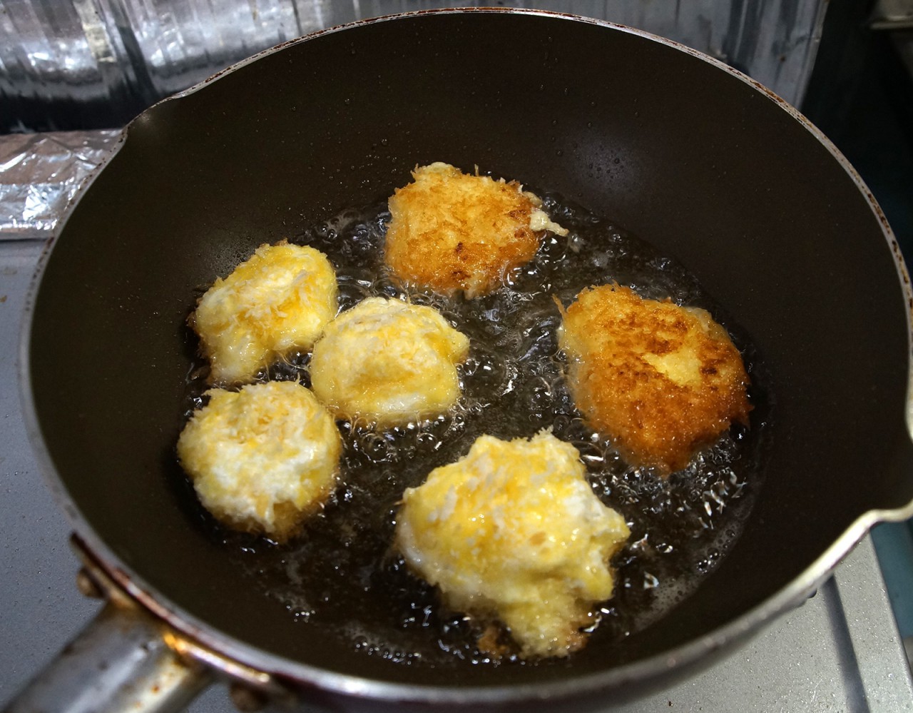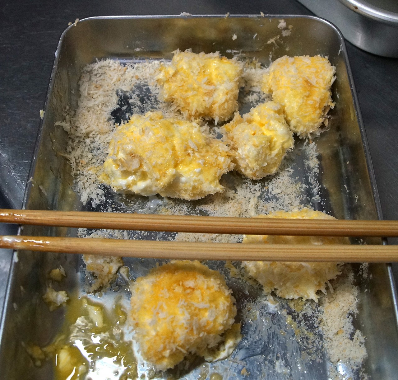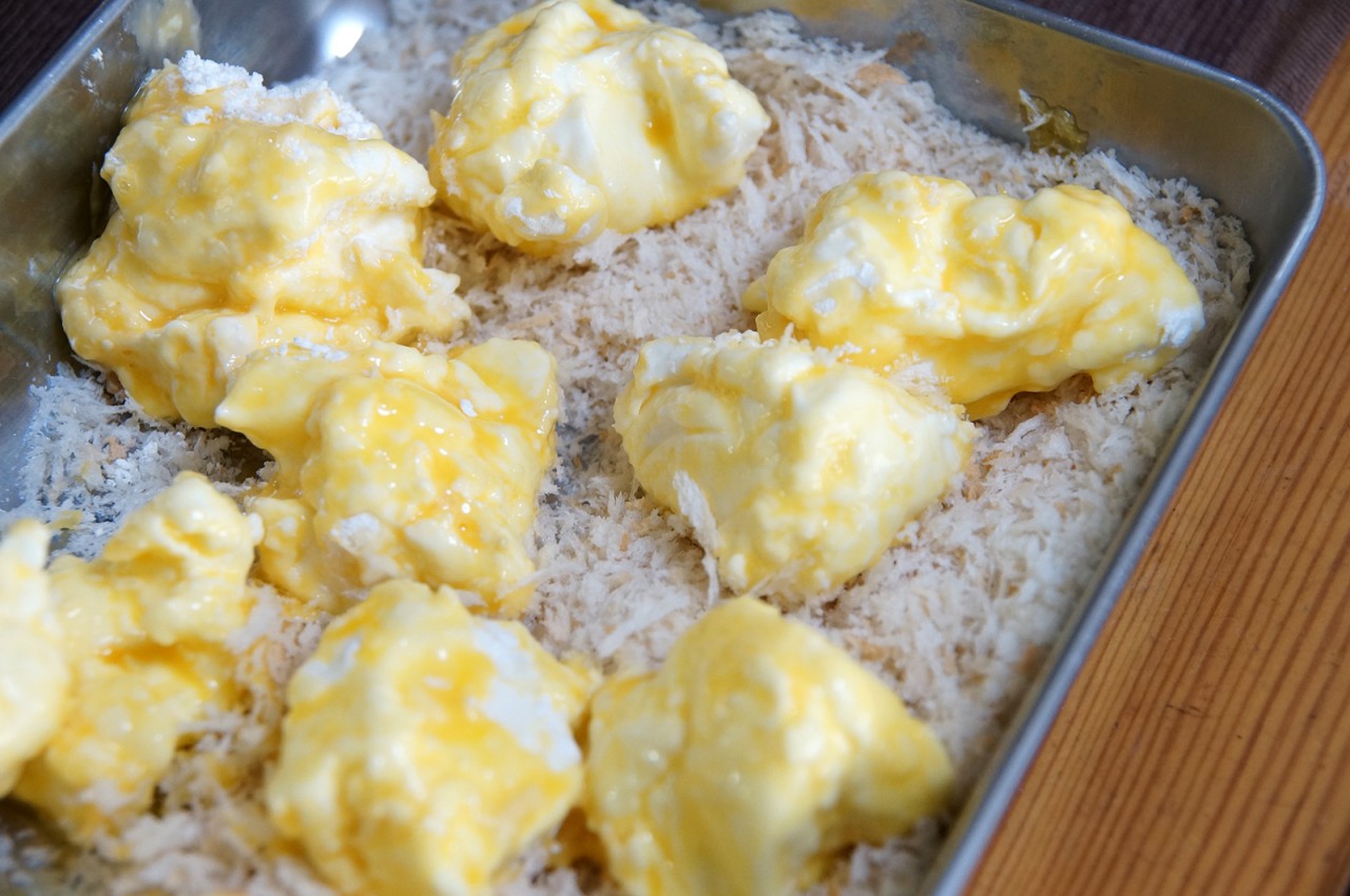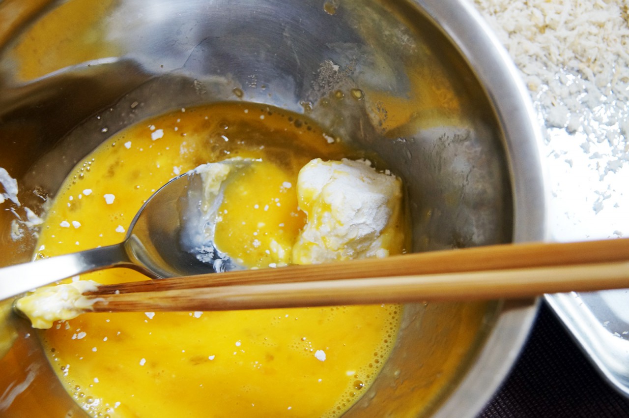 12時間水を切るとさすがに固くなるんですが、それでも手でつまんでアレコレってのは難しく、スプーンですくって菜箸を駆使しつつ、小麦粉まぶしーの、卵液につけーのです。
