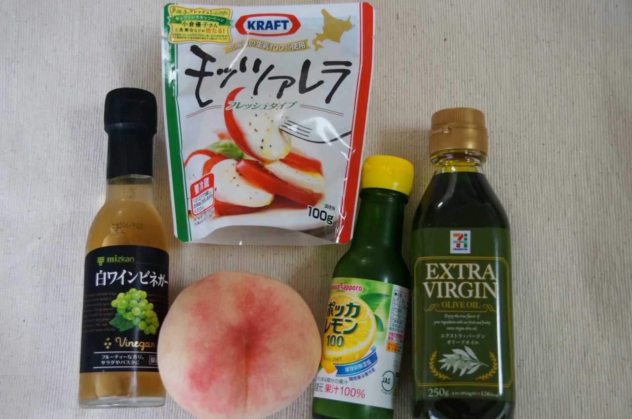 というわけで、桃とモッツァレラと、普段の調理ではあまり使わない白ワインビネガーなるシロモノを調達しなけりゃなりません。と、なると、