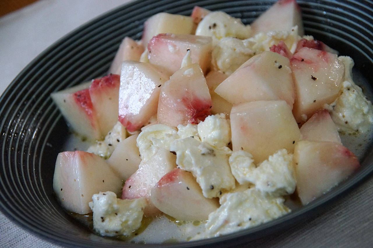 硬い桃にモッツァレラをちぎって乗せる、の図。モッツァレラは思っていたより、ちぎり心地が良くなかったです。ちぎり欲としては消化不良だ!