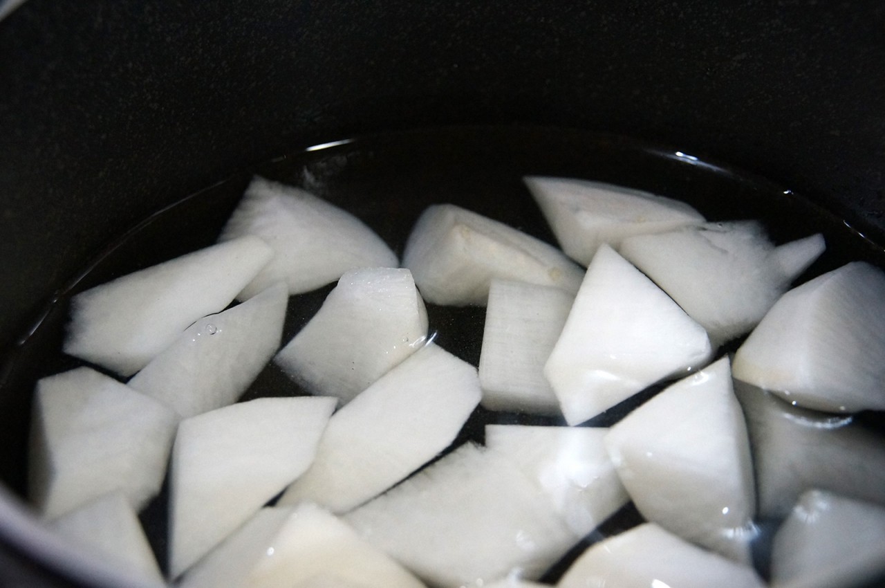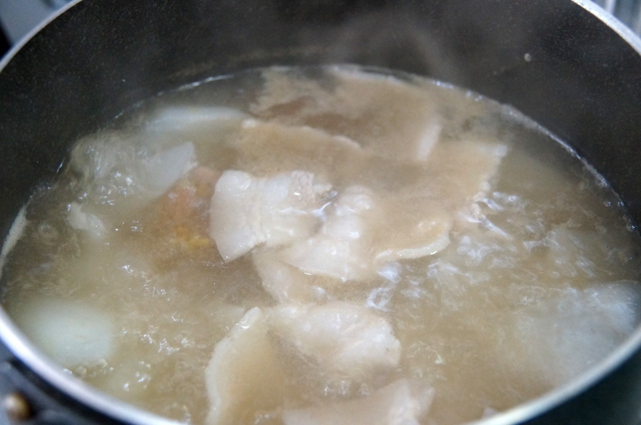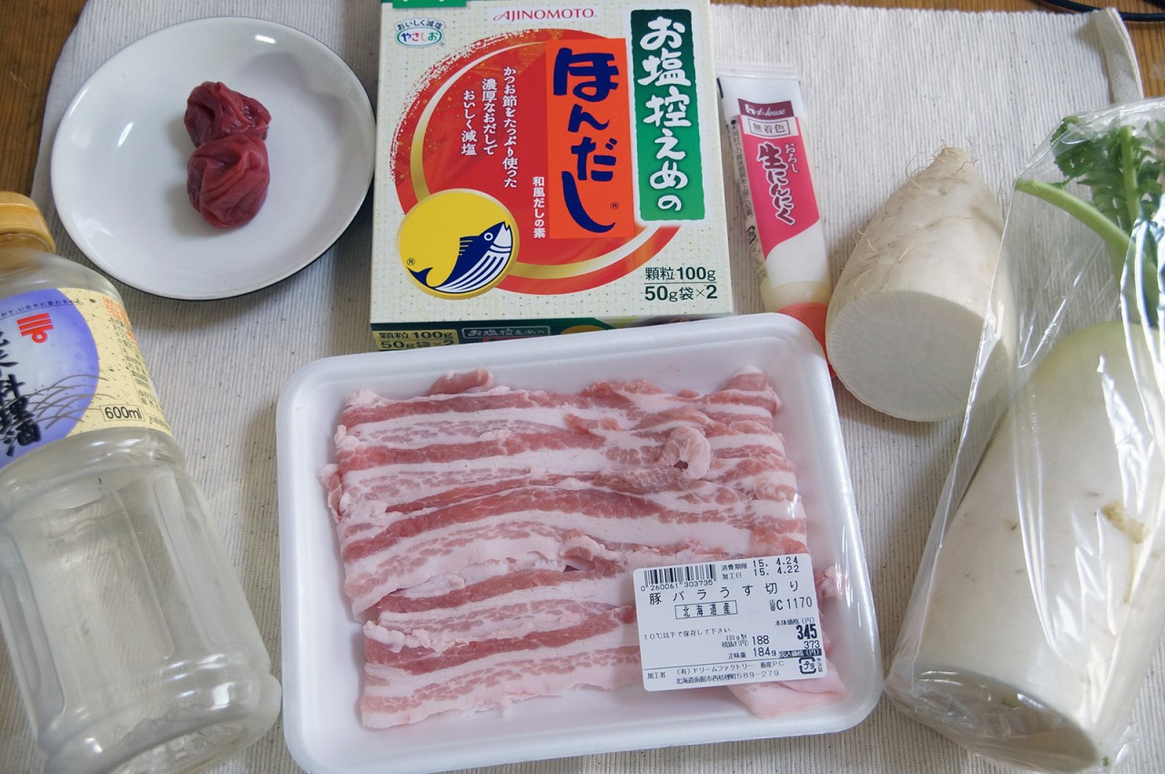 乱切りにした大根を鍋に入れて、かぶるくらいの水を入れて茹でること15分。おおよそ透明になって、鍋の水も多少減ります。ここで、「ほんだし」を溶かした水、酒、豚肉、梅干し、ニンニク(チューブ)をドサッと入れて煮込みます。