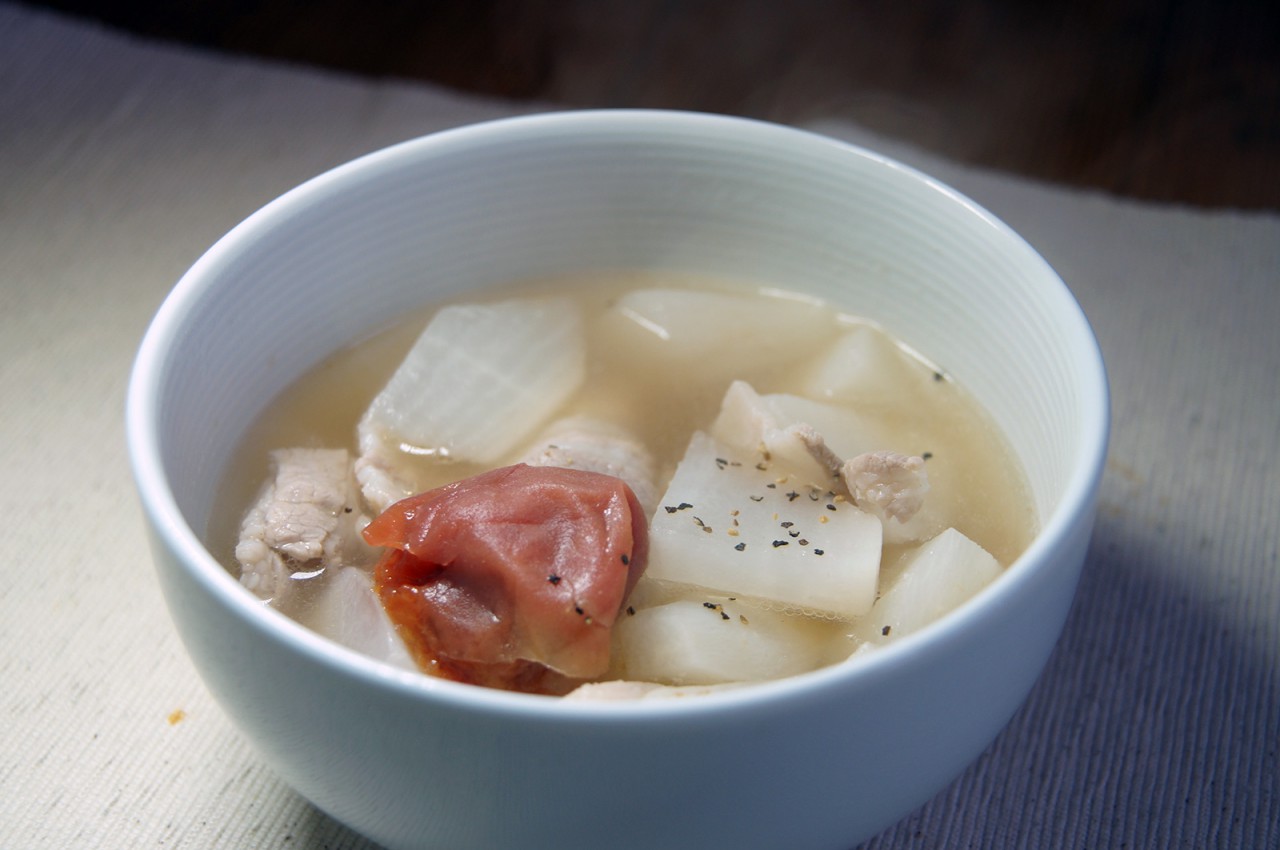 手持ちの材料でサクッと作れそうだったのがこの「大根と豚の梅ぇスープ」。なんだかんだと疲れが溜まりがちな春先ですからね。梅干しと豚肉ってのは、リンク先のレシピでも触れているように疲労回復にバッチコイな組み合わせですし、大根は常に冷蔵庫に控えているわけで。