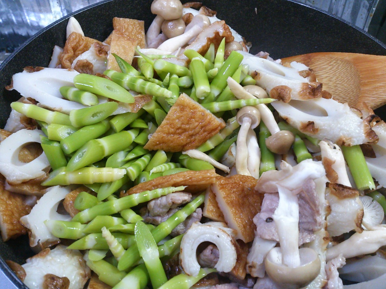 作りながらスマホのカメラで撮影するのは簡単だけど、難しいですな。。。丁寧に皮を剝いて処理されたものをいただきましたので、包丁で斜めに切っていき、同時にチクワやさつま揚げ的なもの、それから少しの豚肉(たまたま残っていた)、シメジ(たまたまあった)と一緒に炒め煮にしました。