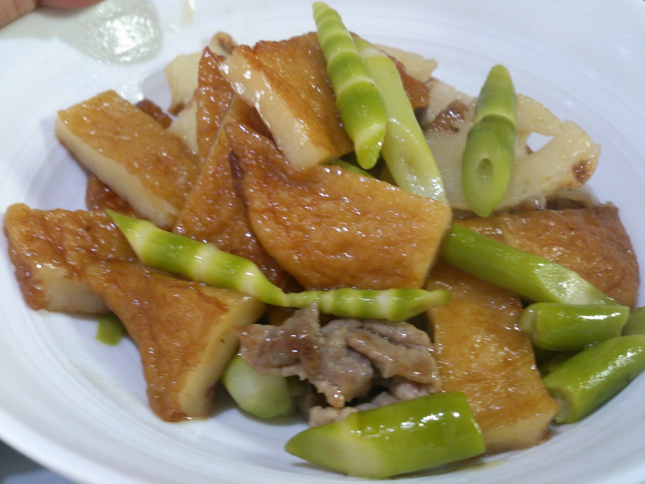 うれしくありがたいことに、山菜の細いタケノコを頂いたので「チンジャオロースもどき」と上の写真の通り、「練り物天国な炒め煮」にしていただきました!美味しかったぁ~!