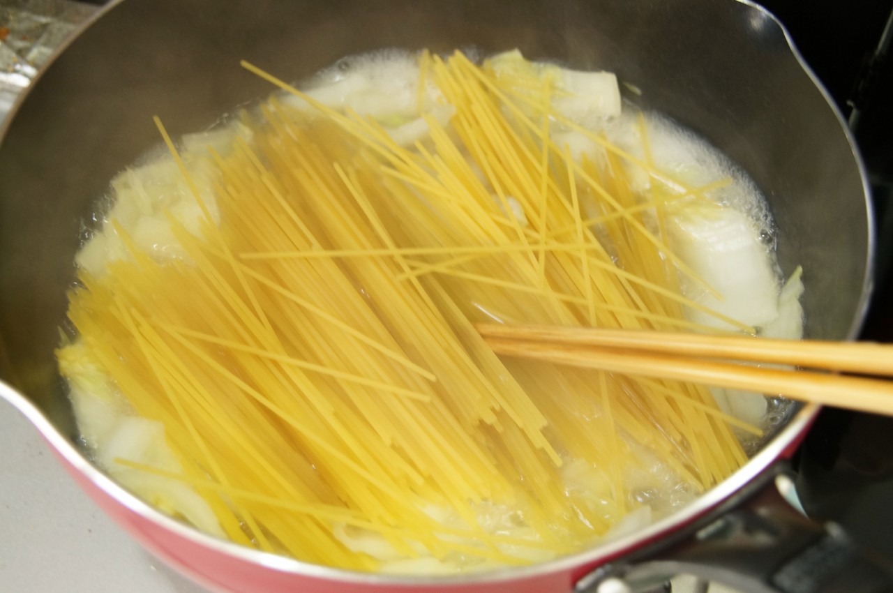 フタをしてぶくぶく煮込む。途中、蓋を開けてみてかき混ぜたり(麺がくっつくのを防ぐ)、水を足したりする。