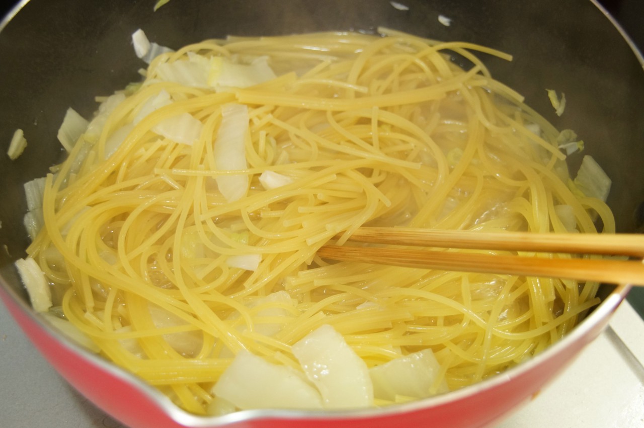 柔らかくなるものなんですねえ。。。煮汁でそのままパスタ茹でるとか初体験。たしかに、味を吸うし洗い物は減るし一石二鳥で目からウロコ。