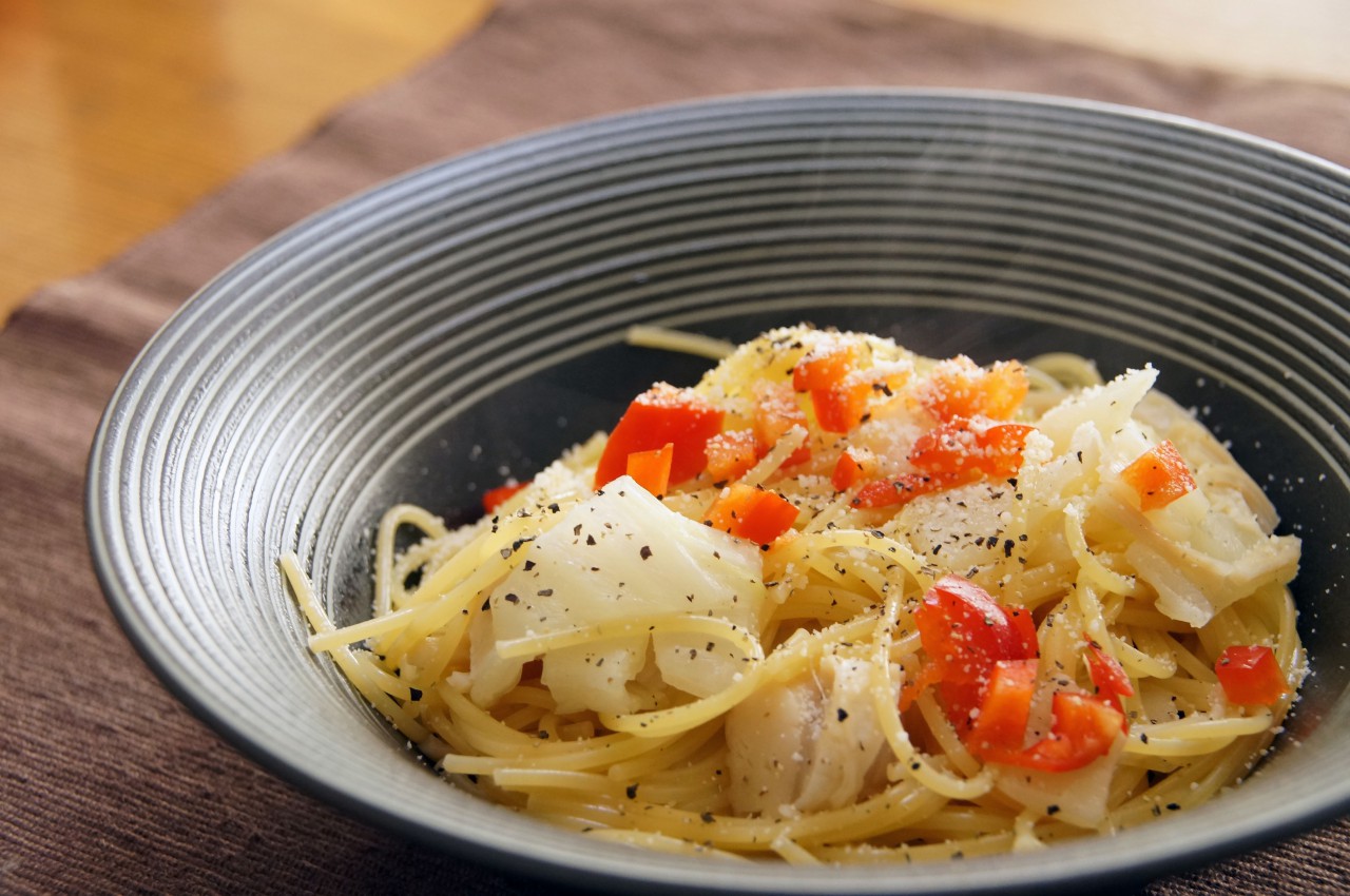 - ホタテや白菜、和風だしの味がしっかりパスタに染み込んでいて旨い