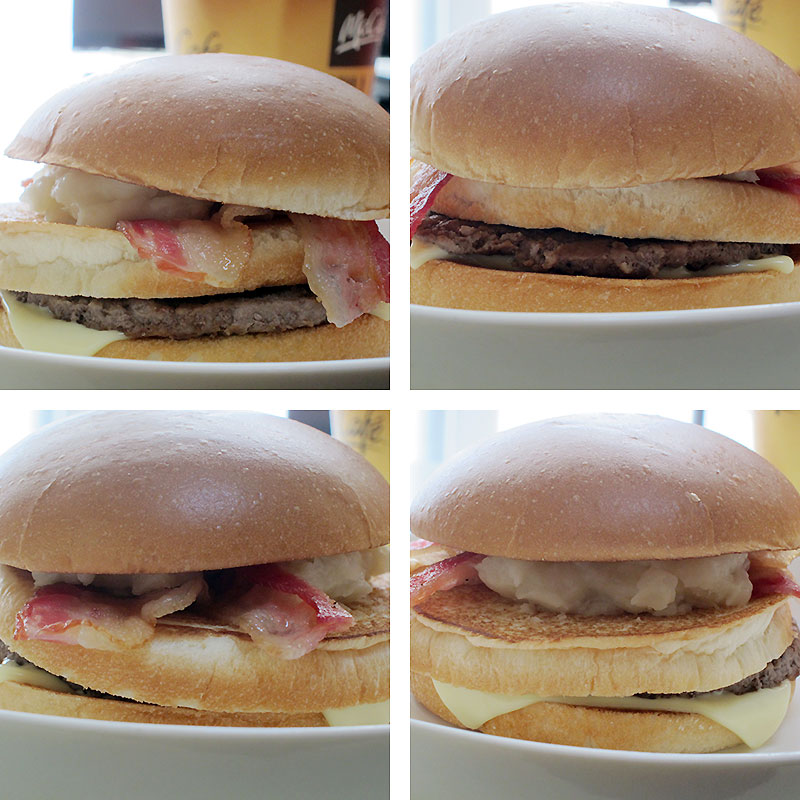 正面・左面・右面・後面から一枚ずつ撮影。予想よりもだいぶ普通。てか、雑じゃない。あんまりジューシーそうじゃなかったり、写真ほど盛々じゃないのは、マクドクオリティでいつものことだからキニシナイ。