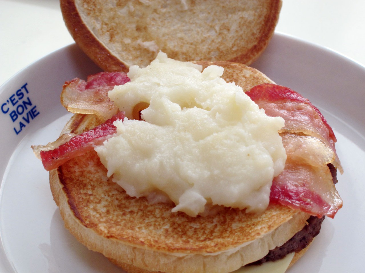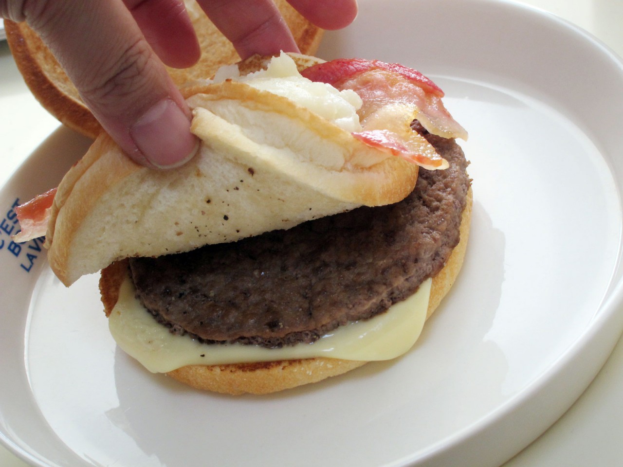 上のバンズを持ち上げるとカリカリ?ベーコンとマッシュポテトがちゃんとONしてる。出回ってる写真に比べると、その写真がネタじゃないのなら、優秀なんじゃあ無いのかな?コープさっぽろ湯川店のマクドナルドクルーは。