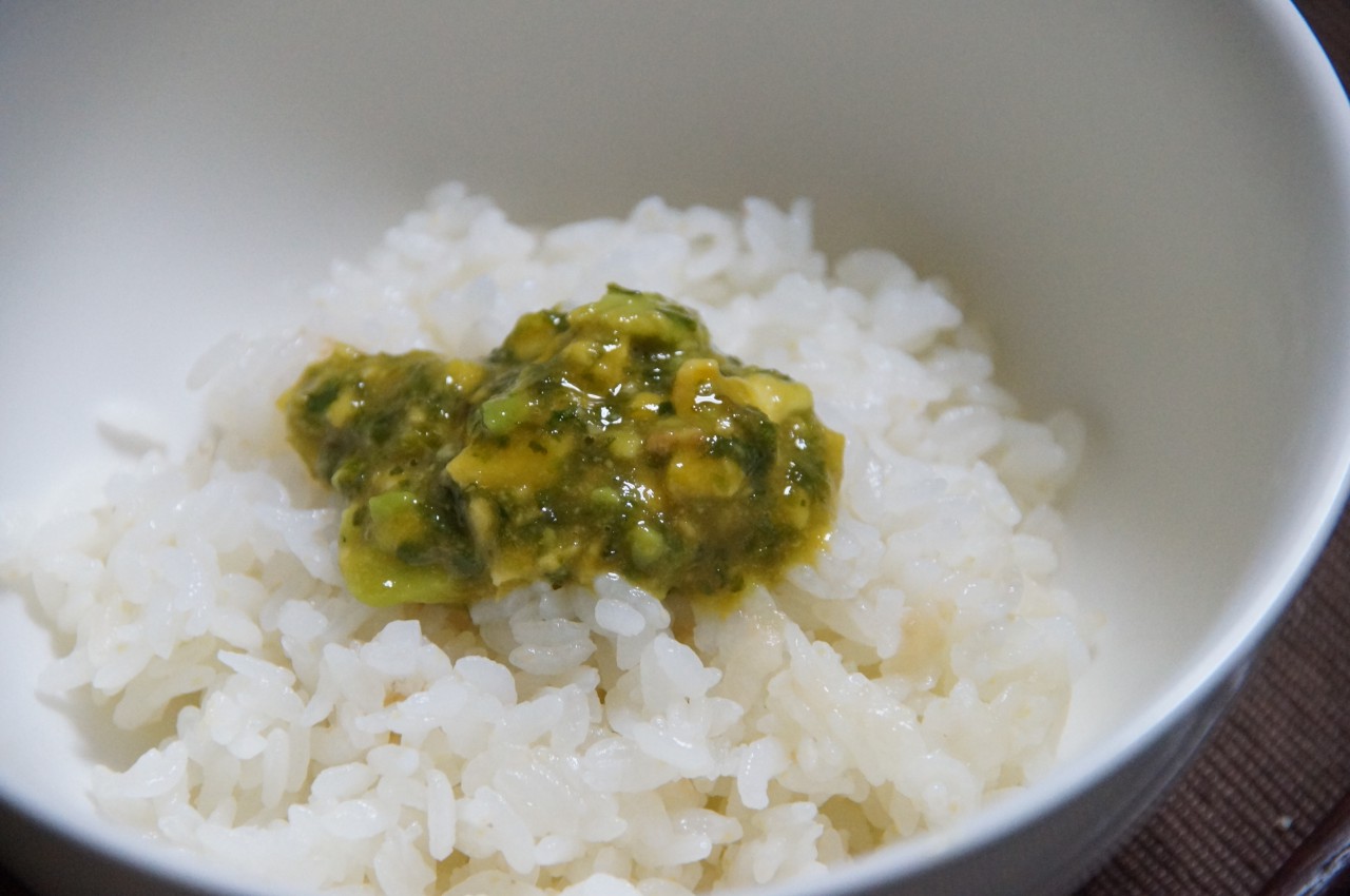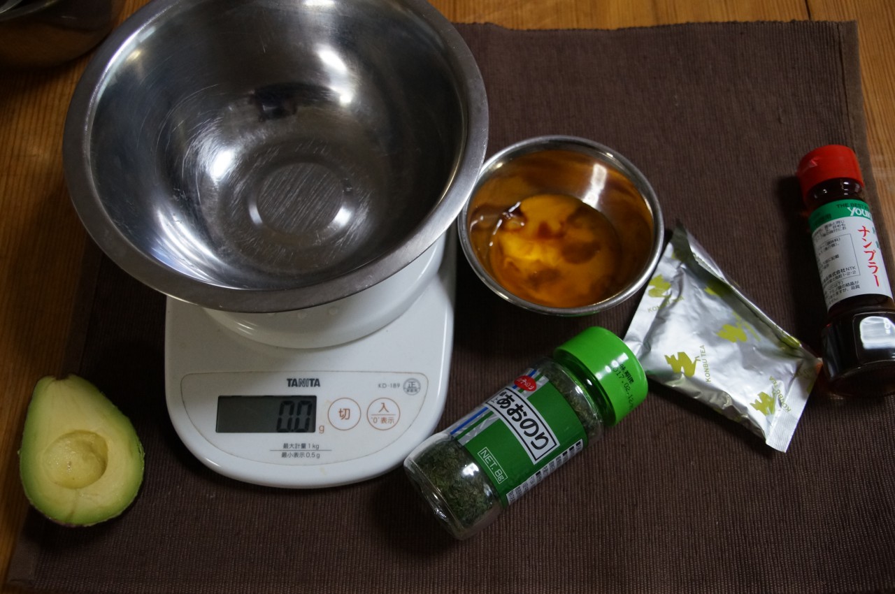 卵黄:アボカド=1:2・青のり小さじ1と1/3・昆布茶1.5g・ナンプラー1.5g・砂糖0.5g・味の素0.8g